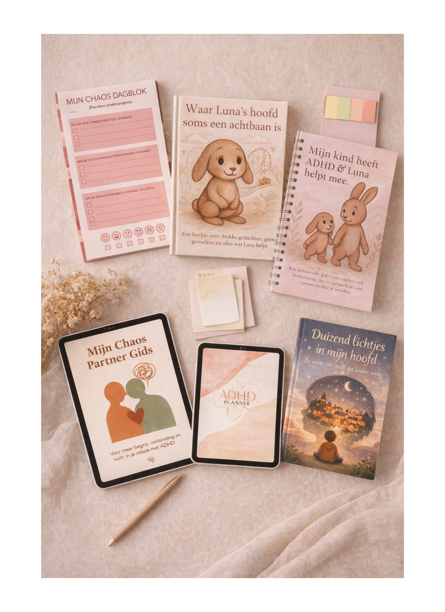 Alles wat je hier vindt, is bedacht vanuit onze eigen chaos met humor, zachtheid en een flinke dosis herkenning.