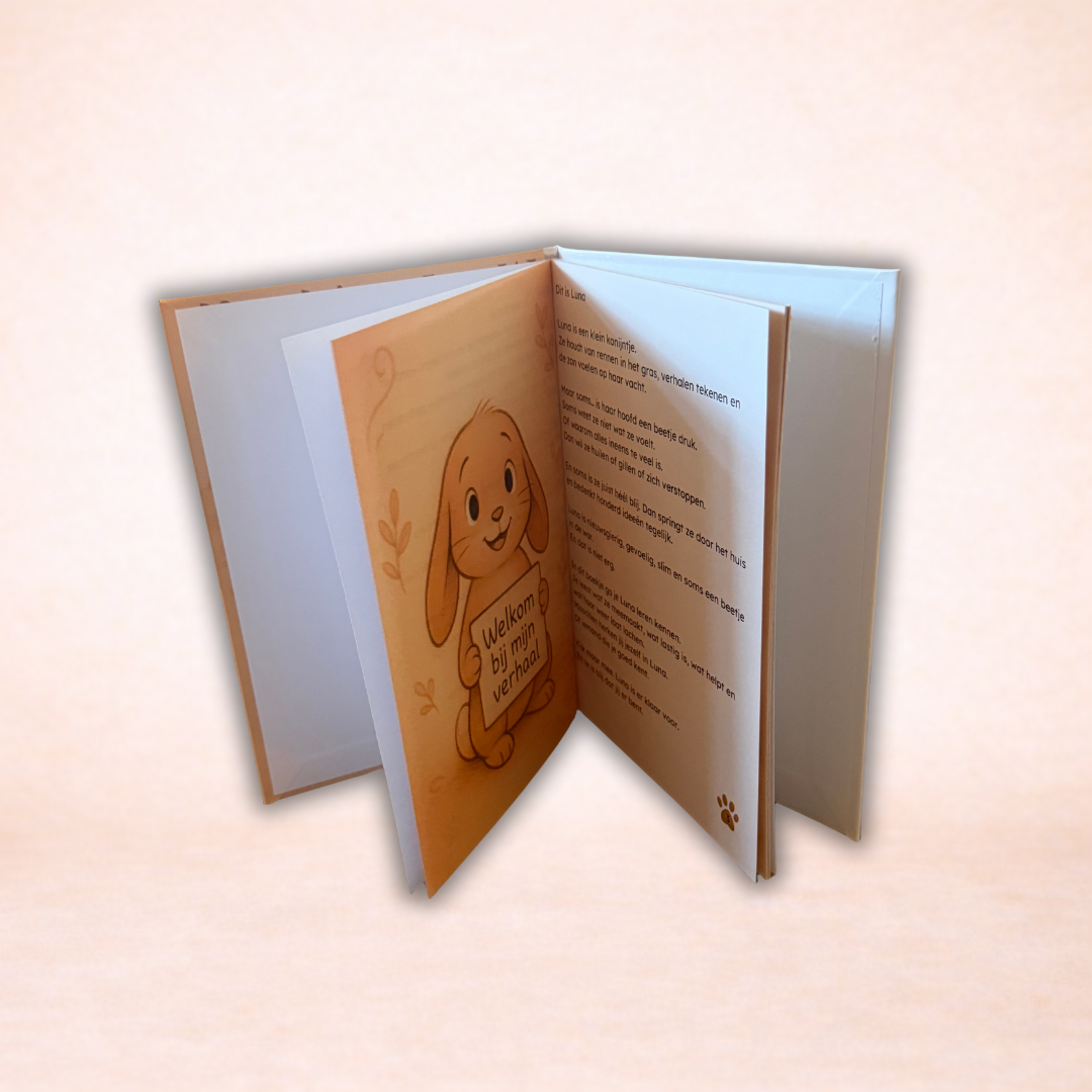 In dit unieke fysiek kinderboek met meer dan 30 pagina’s volg je Luna, een nieuwsgierig konijntje met een druk hoofd, een groot hart en héél veel vragen.