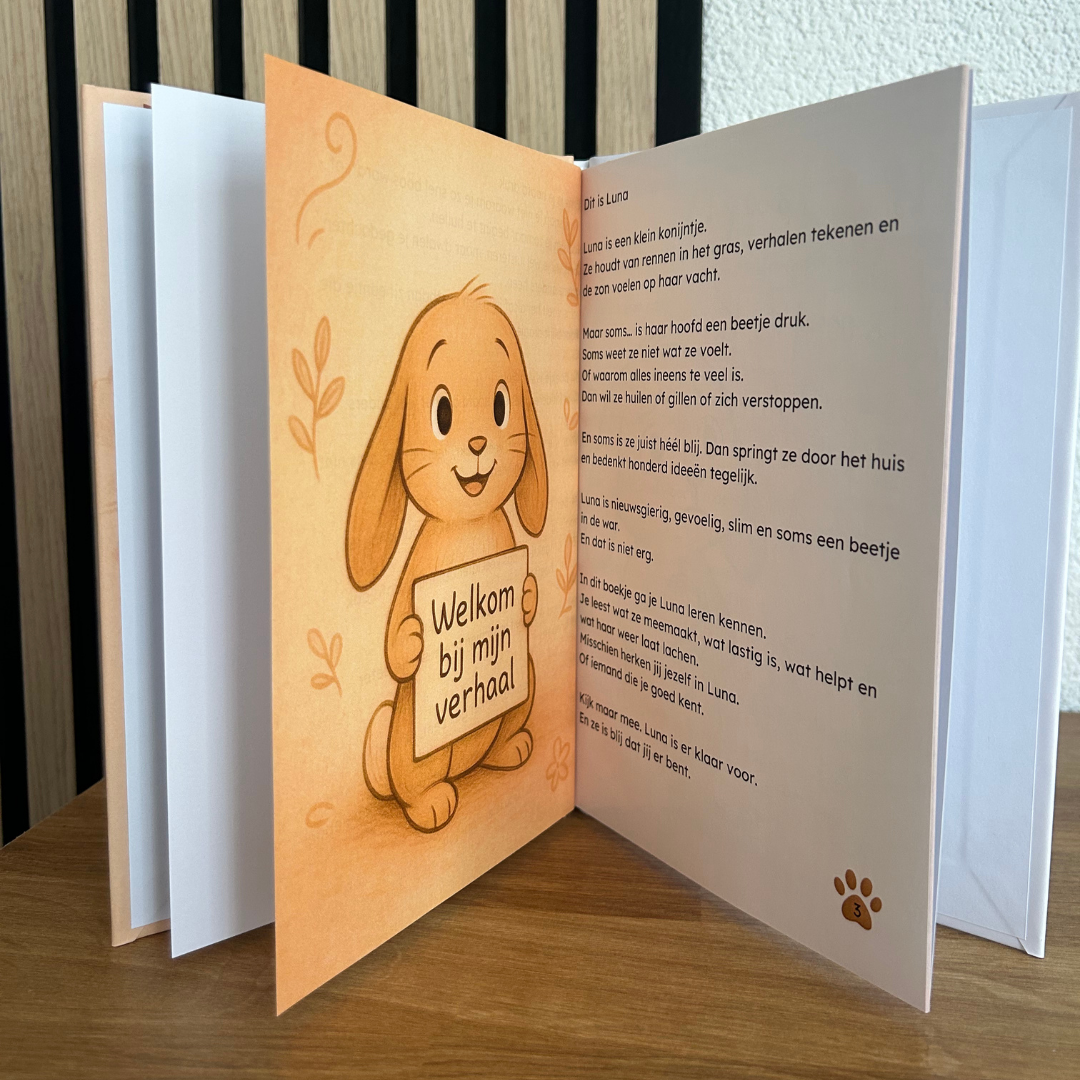 In dit unieke fysiek kinderboek met meer dan 30 pagina’s volg je Luna, een nieuwsgierig konijntje met een druk hoofd, een groot hart en héél veel vragen.