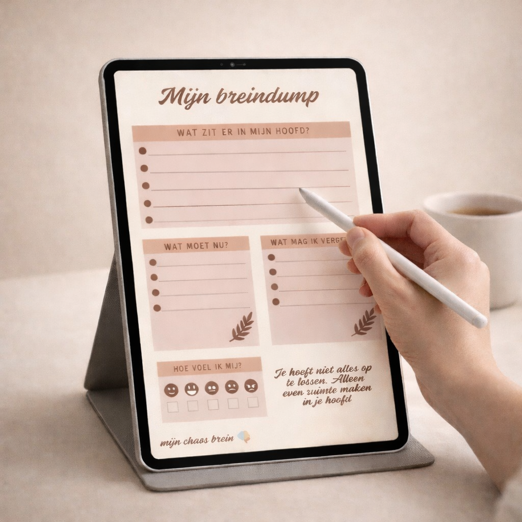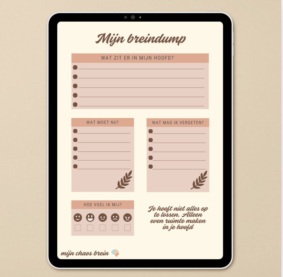 Een flexibele digitale planner met weekplanner, dagplanner, moodtracker en meal planner. Ontworpen voor drukke hoofden die behoefte hebben aan overzicht, zonder vast te lopen in perfectie. Braindump | Digitale mindclear tool. Een praktische tool om alles wat in je hoofd zit eruit te schrijven. Gedachten, to do’s, zorgen en ideeën krijgen een plek, zodat je weer ruimte en rust kunt ervaren.